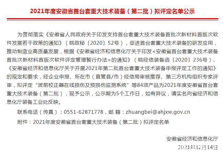 2021年度安徽省首台套重大技术装备(第二批)拟评定名单