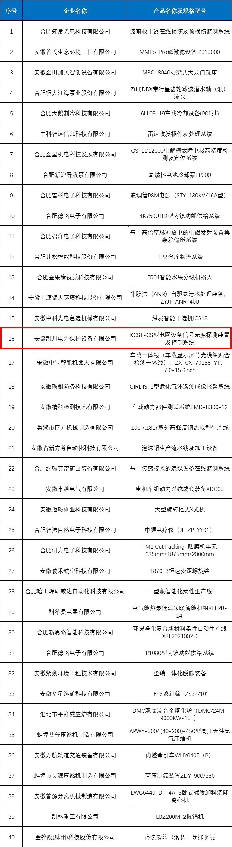 2021年12月14日,安徽省经济和信息化厅发布“2021年度安徽省首台套重大技术装备(第二批)拟评定名单公示”,我公司研发的“KCST-CS型电网设备信号无源探测装置及控制系统”成功入选!