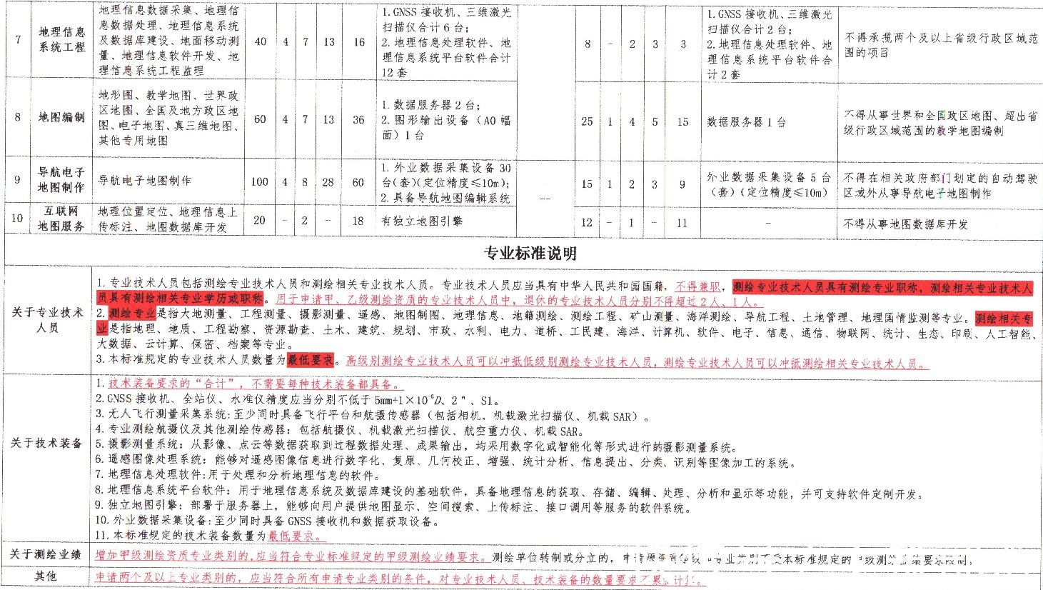 意思就是说满足人员及设备最大值就行,举个例子,比如申请地理信息系统乙级和工程测量乙级两个专业,需要的人员及设备情况是:测绘专业中级人员2人,测绘专业初级人员3人,测绘相关专业人员3人,GNSS接收机、全站仪、水准仪、地下管线探测仪合计4台,地理信息处理软件、地理信息系统平台软件合计2套。